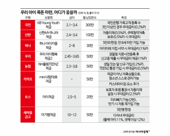 13일 은행권에 따르면 미성년자 고객을 위해 다양한 은행 적금 상품이 출시되고 있다. 금리는 최저 2%에서부터 최고 12%, 월 납입한도의 경우 20만원에서 300만원까지 다양하다. 5대 은행들은 자사 애플리케이션(앱)에서 '아이통장 만들기'와 같은 아이 관련 금융 서비스를 제공하고 있다. 갓 태어난 아이를 겨냥한 대표적인 상품은 하나은행의 '하나 아이키움 적금'이다. 아동 양육을 위한 수당 수급자 및 임산부와 다자녀 가구에 우대 금리를 제공하는 게 특징이다. 만기는 1년이며 월 최대 30만원까지 납입할 수 있으며 5만좌 한정으로 올해 12월31일까지 판매한다. 기본금리는 2%이며, 우대금리를 받을 수 있는 조건은 양육수당 수급 또는 임산부(2%), 당행 주택청약종합저축 보유(0.6%), 아이 미래 지킴 서약(1%), 하나 합 서비스 가입(0.3%), 마케팅 동의(0.1%)다. 여기에 자녀 수가 2명인 경우 1%, 3명 이상이면 2%다. 국민은행은 지난해 8월 비슷한 성격의 'KB아이사랑적금'을 출시해 지난 1일 자로 5만좌 모두 판매했다.