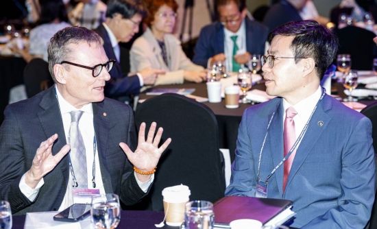여한구 산업통상자원부 통상교섭본부장과 2024 노벨경제학상 수상자인 제임스 로빈슨 시카고대학교 교수가 12일 서울 여의도 FKI그랜드볼룸에서 열린 '제32차 태평양경제협력위원회 총회'에 참석해 의견을 나누고 있다.