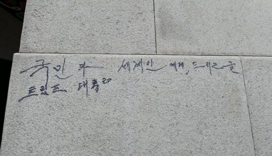 서울 종로경찰서는 경복궁 광화문 석축에 매직으로 '트럼프 대통령' 등의 낙서를 한 김모(79)씨를 응급입원 조치했다고 12일 밝혔다.