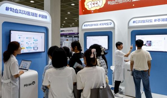 13일 서울 강남구 코엑스에서 열린 '제16회 2025 에듀플러스위크 미래교육박람회'에 참가한 관람객들이 디지털 교육 자료를 보고 있다.