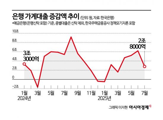 13일 한국은행이 발표한 '2025년 7월 중 금융시장 동향'에 따르면 지난달 말 은행 가계대출 잔액은 1164조2000억원으로 전월 말 대비 2조8000억원 증가했다. 전월(6조2000억원) 대비 증가 규모가 상당폭 줄었다.