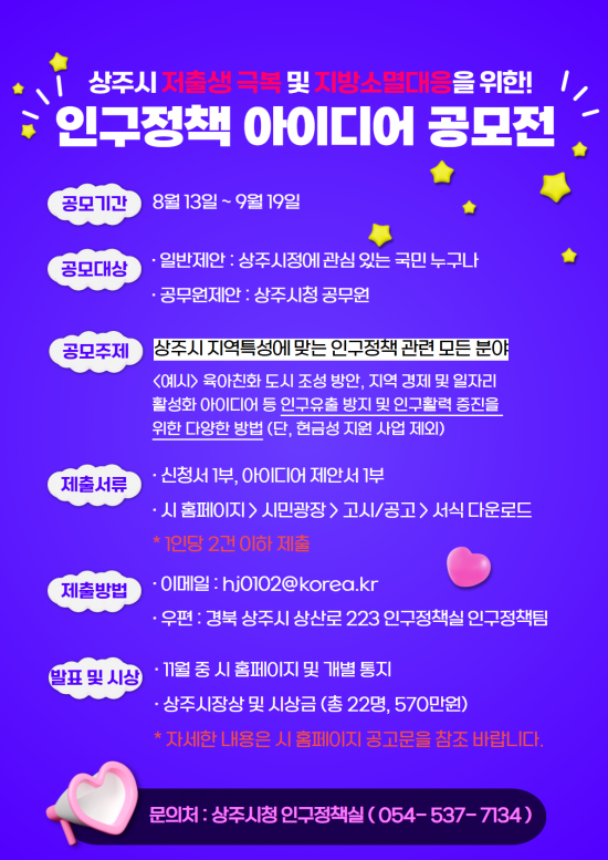 경북 상주시는 인구감소와 지역소멸 위기에 대응하기 위해 창의적이고 실효성 있는 정책 제안을 발굴하는 '상주시 인구정책 아이디어 공모전'을 개최한다고 13일 밝혔다.