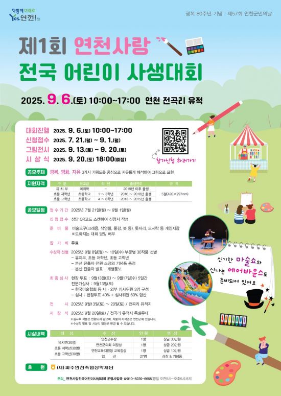 경기 연천군이 광복 80주년을 기념하고 미래 세대에게 광복의 의미와 평화·자유의 가치를 전하기 위해 '제1회 연천사랑 전국 어린이 사생대회'를 개최한다고 14일 밝혔다.