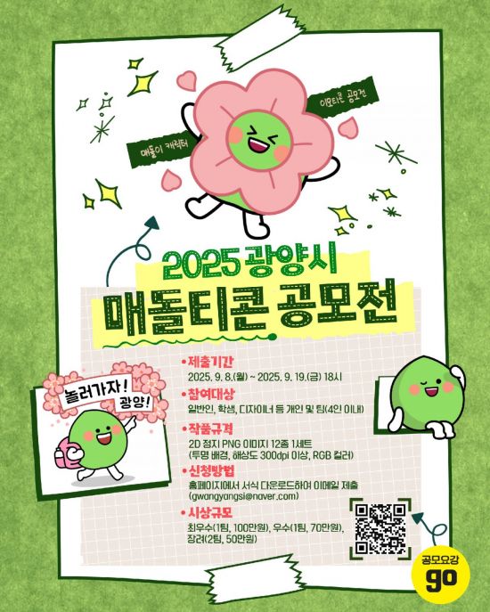 전남 광양시는 14일 대표 캐릭터 '매돌이'에 대한 시민의 관심과 애정을 높이고 인지도를 제고하기 위해 '2025 광양시 매돌티콘 공모전'을 개최한다고 밝혔다.