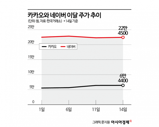 18일 한국거래소에 따르면 지난 14일 카카오는 전일 대비 1.42% 상승한 6만4400원에 마감했다. 이달 들어 11.03% 상승했다. 네이버는 0.22% 하락한 22만4500원에 장을 마쳤다. 이달 들어 4.47% 하락했다.
