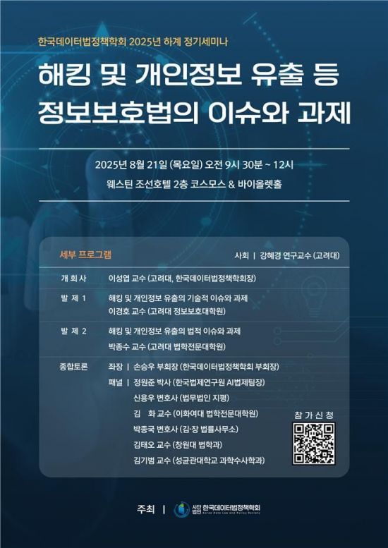 최근 통신사 해킹과 대규모 개인정보 유출 사건이 잇따르는 가운데, 법·기술 전문가들이 모여 대응 방안을 논의하는 자리가 마련된다. 한국데이터법정책학회는 오는 21일 오전 9시 30분부터 서울 웨스틴조선호텔 2층 코스모스&바이올렛홀에서 '해킹 및 개인정보 유출 등 정보보호법의 이슈와 과제'를 주제로 하계 정기세미나를 연다.