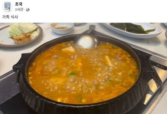 조 전 대표는 당일 저녁, 인덕션에서 끓는 찌개 장면을 담은 영상을 자신의 페이스북에 올리고 '가족 식사'라고 짧게 소감을 남겼다. 이는 정경심 전 교수를 비롯한 가족들과 함께 첫 외식 후 게시된 것으로 보인다.