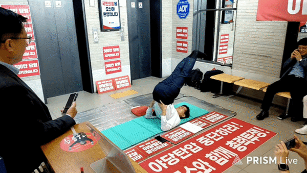 정장 벗고 로비 바닥서 8분간 체조 시연