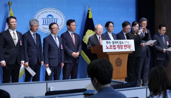 손경식 한국경영자총협회 회장 등 경제 6단체장들이 18일 국회 소통관에서 노조법 개정 중단 촉구 기자회견을 하고 있다.