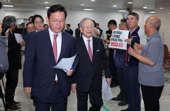 손경식 한국경영자총협회 회장 등 경제 6단체장들이 18일 국회 소통관에서 노조법 개정 중단 촉구 기자회견을 하기 위해 입장하고 있다.