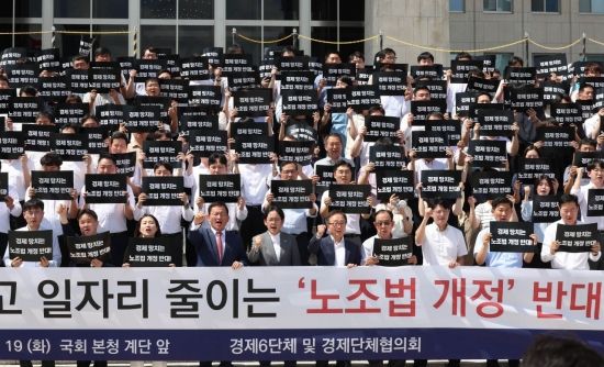 경제6단체 및 경제단체협의회 등 관계자들이 19일 국회 본청 앞 계단에서 열린 노동조합법 개정 반대 경제계 결의대회를 하고 있다.