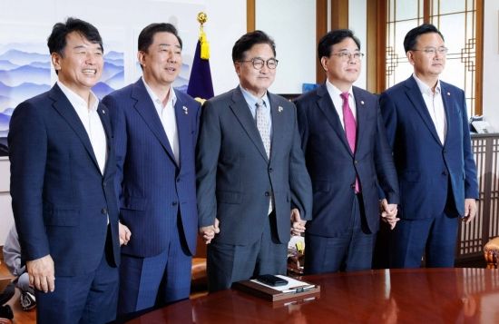 우원식 국회의장과 김병기 더불어민주당 원내대표, 송언석 국민의힘 비상대책위원장 겸 원내대표가 19일 국회에서 열린 의장 주재 여야 원내대표 회동에서 기념촬영을 하고 있다. 왼쪽부터 문진석 더불어민주당 원내운영수석부대표, 김 원내대표, 우 의장, 송 원내대표, 유상범 국민의힘 원내수석부대표. 2025.8.19 김현민 기자