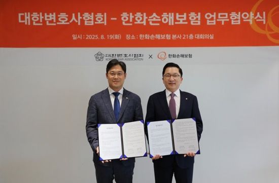 대한변호사협회(협회장 김정욱)가 19일 한화손해보험(주)(대표이사 나채범)과 업무협약을 맺었다. 보험서비스 기반 마련과 생태계 구축을 위해서다.