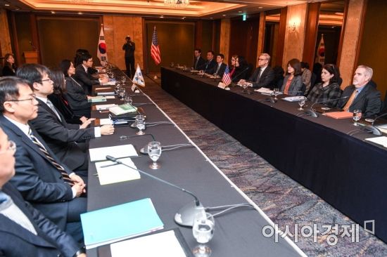 유명희(왼쪽 다섯 번째) 산업통상자원부 통상정책국장과 마이클 비먼 미국(오른쪽 네 번째) 무역대표부 대표보가 31일 서울 중구 롯데호텔에서 열린 '제2차 한미 FTA 개정협상'에 참석해 회의시작을 기다리고 있다./강진형 기자aymsdream@