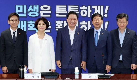 김병기 원내대표와 한정애 정책위원회 의장 등 민주당 지도부와 구윤철 경제부총리 겸 기획재정부 장관, 배경훈 과학기술정보통신부 장관 등은 이날 국회에서 새 정부 경제성장전략의 밑그림을 논의했다.