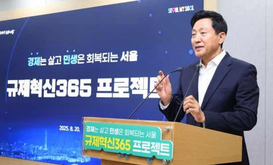 오세훈 서울시장이 20일 서울 중구 서울시청 브리핑룸에서 '규제혁신 365 프로젝트' 관련 기자설명회를 하고 있다.