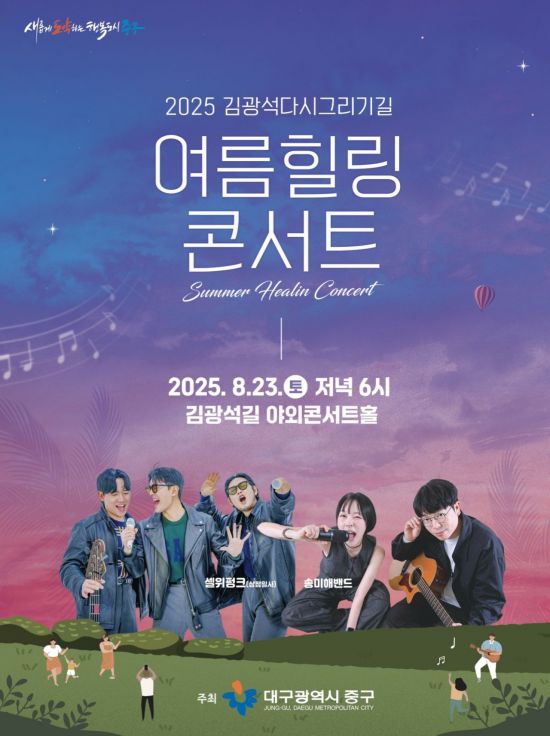 대구 중구(구청장 류규하)는 23일 오후 6시 김광석다시그리기길 야외콘서트홀에서 '김광석다시그리기길 여름 힐링콘서트'를 개최한다.