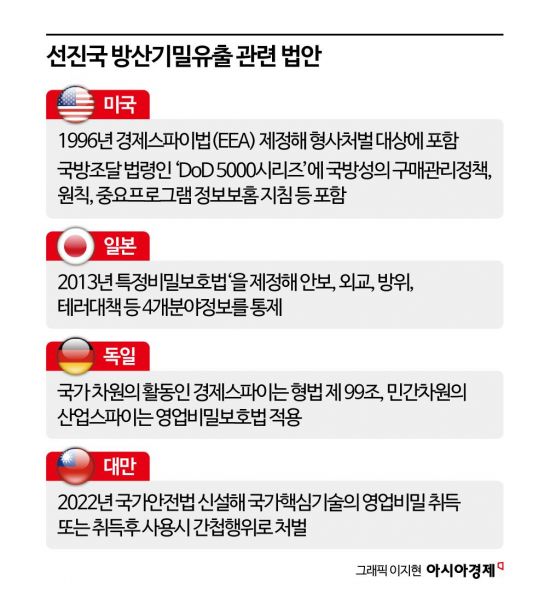 반면 선진국은 방산기밀유출에 엄격하다. 미국은 방산기술과 일반 산업기술을 나누지 않는다. 다양한 법안을 만들어 빠져나가지 못하게 하고 있다. 1996년 경제스파이법(EEA)를 제정해 형사처벌 대상에 포함했다. EEA는 경제스파이로 간주될 경우 500만달러 이하의 벌금 또는 15년 이하의 징역에 처한다. 방위산업과 관련된 별도 법안도 있다. 국방조달 법령인 'DoD 5000시리즈'이다. 이 법령에는 국방성의 구매관리정책, 원칙, 중요프로그램 정보보호 지침 등을 담았다. 조직도 탄탄하다. 국방성 산하 국방보안서비스국(DSS)와 방산기술보안국(DTSA)는 방산 기밀 유출에만 대응하도록 했다. 특히 해킹에 대비해 2019년에는 국방성 산하에 '미 국방정보유출 방지 및 보호국(DCSA)'를 두어 국방종사자 심사, 방산 유출 방지 등을 맡고 있다.
