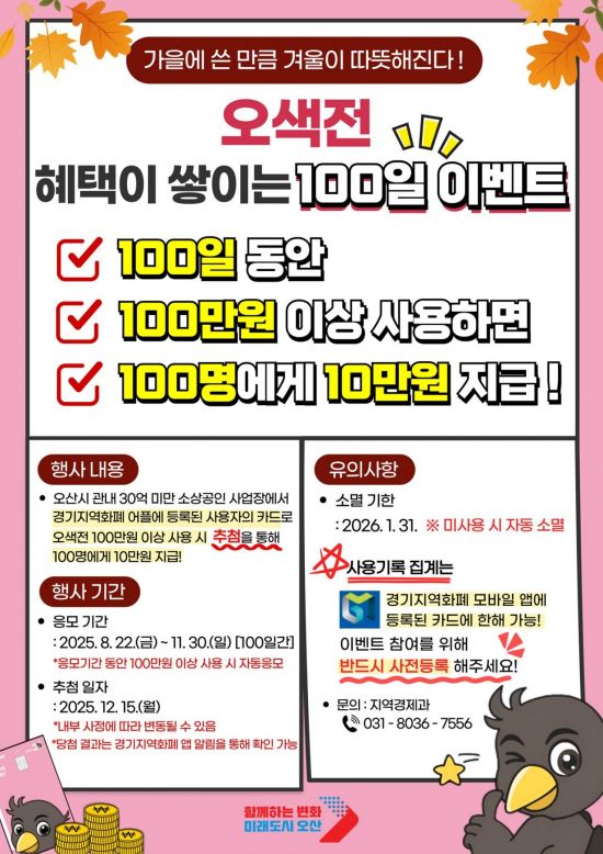 경기도 오산시는 지역경제 활성화를 위해 22일부터 11월 30일까지 100일간 '오색전 100·100·100 이벤트'를 진행한다.