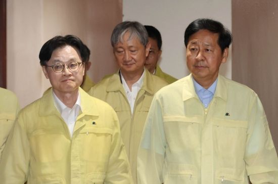 구윤철 경제부총리 겸 기획재정부 장관을 비롯한 김정관 산업통상자원부 장관, 이찬진 금융감독원장 등이 20일 서울 종로구 정부서울청사에서 열린 산업경쟁력강화 관계장관회의에 참석하고 있다.