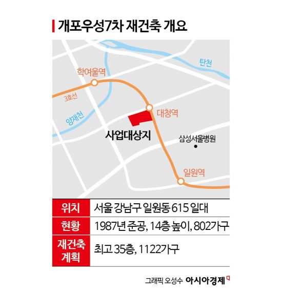 21일 정비업계에 따르면 개포우성7차 재건축 조합은 23일 총회를 열고 시공사를 결정한다. 개포우성7차는 1987년 준공된 단지로 현재 15층 높이, 802가구 규모다. 재건축이 완료되면 최고 35층, 1122가구로 재탄생하게 된다. 사업비는 약 6778억원이다.