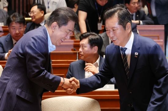 정청래 더불어민주당 대표와 김병기 원내대표가 21일 국회에서 열린 의원총회에서 악수하고 있다.
