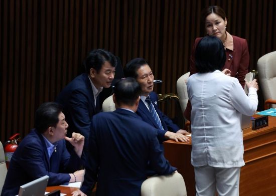 정청래 더불어민주당 대표와 김병기 원내대표 등 지도부가 21일 국회 본회의에서 대화하고 있다.