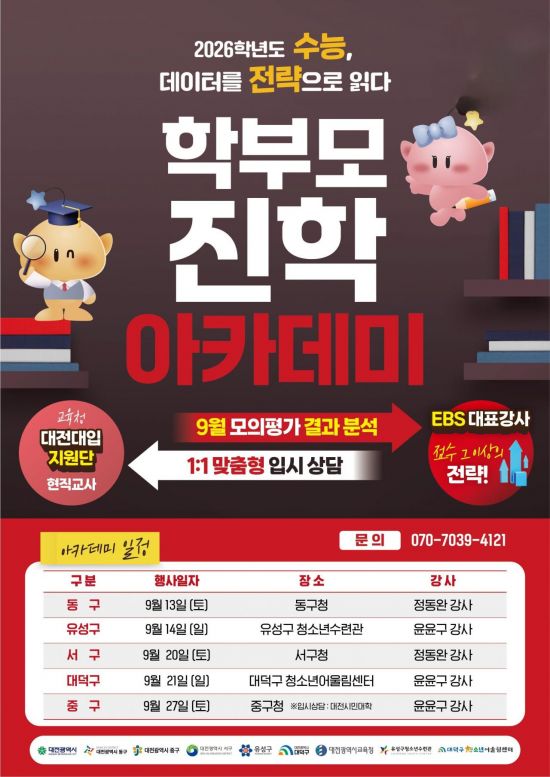 이기영 대전시 교육도서관과장은 "수험생은 물론 학부모의 긴장감이 높아지는 시기"라며 "이번 아카데미가 불안을 덜고 부족한 부분을 정확히 보완해 좋은 결과로 이어지는 디딤돌이 되길 바란다"고 말했다.