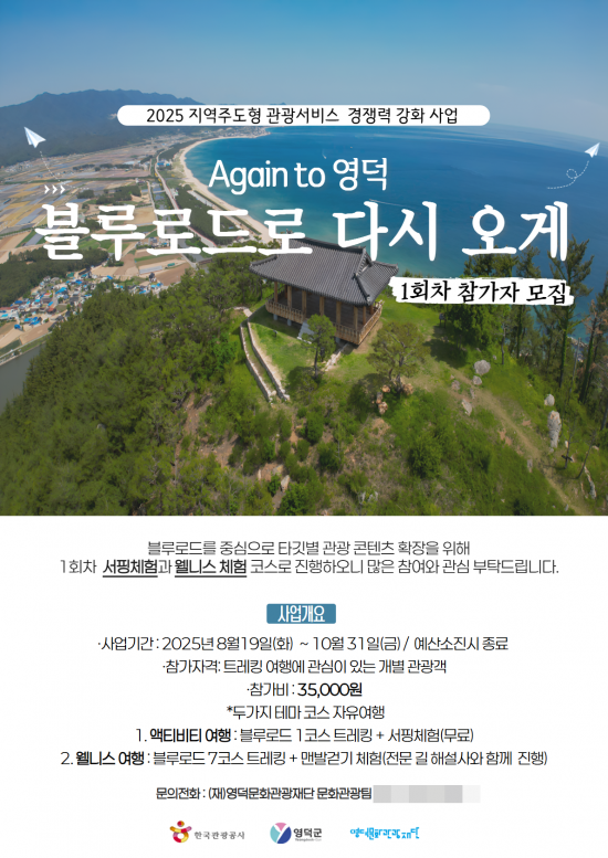 본 사업은 '2025 지역주도형 관광서비스 경쟁력 강화사업'의 일환이며, 고객 맞춤형 블루로드 프로그램을 운영해 대형 산불 참사 이후 줄어든 외지 관광객이 다시 영덕 블루로드를 찾을 수 있도록 유도하기 위해 기획됐다.