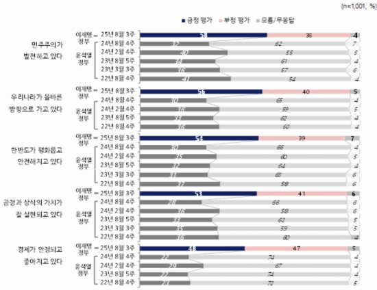 국정 비전 및 가치 평가에 대한 조사에서는 현 정부가 앞선 윤석열 정부보다 눈에 띄게 개선되는 흐름을 보였다. '민주주의가 발전하고 있다'(58%), '우리나라가 올바른 방향으로 가고 있다'(56%), '한반도가 평화롭고 안전해지고 있다'(54%), '공정과 상식의 가치가 잘 실현되고 있다'(53%), '경제가 안정되고 좋아지고 있다'(48%) 등으로 조사됐다. 이 같은 지표는 윤석열 정부 기간 4차례의 조사 결과를 모두 웃도는 수준이다.