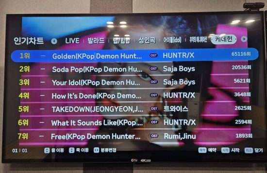 TJ미디어는 트렌드에 발맞춰 지난 14일부터 노래방 인기차트 내 '케데헌' 전용 카테고리를 신설, 이용자들이 '케데헌' OST를 빠르고 손쉽게 찾아 부를 수 있게 했다. 현재 TJ노래방에 수록된 '케데헌' OST는 골든(Golden), 소다 팝(Soda pop), 유어 아이돌(Your Idol) 등을 포함해 총 7곡이다.
