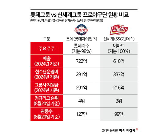 랜더스를 운영하는 신세계야구단은 지난해 매출이 610억원으로 전년 대비 4.3% 증가했으나 영업이익은 20억원으로 55%가량 감소했다. 당장 이마트와 그룹 계열사로부터 나오는 지원금이 전년 245억원에서 216억원으로 줄어든 영향이 크다. 선수단 운영비도 337억원으로 전년 295억원보다 14.2% 상승했다. 같은 기간 롯데의 선수단 운영비는 291억원으로 2023년과 큰 차이가 없었다. 관중 수도 SSG가 적은데 올 시즌 랜더스의 누적 관중 수는 전날까지 99만여명으로 집계됐다.