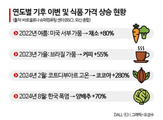 이상기후로 인한 농산물 가격 불안은 이미 전 세계 가계의 식탁 물가를 흔들고 있다. 스페인 바르셀로나 슈퍼컴퓨팅센터(BSC)에 따르면 감자, 쌀, 양파, 상추, 과일 등 주요 식료품 가격은 폭염·가뭄·폭우 같은 기후 충격과 맞물려 급등세를 보였다. BSC의 막시밀리안 코츠 박사는 월스트리트저널(WSJ)에 "탄소 배출량이 넷제로(Net-zero)에 도달하기 전까지 기상이변은 더 심각해질 것이며, 이미 세계 곳곳에서 농작물 피해와 식품 가격 상승을 일으키고 있다"고 설명했다.
