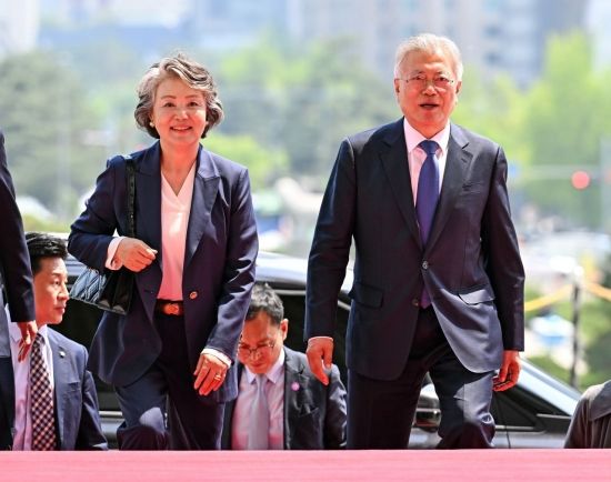 문재인 전 대통령과 김정숙 여사가 25일 국회에서 우원식 국회의장과 면담을 위해 들어서고 있다. 이날 문 전 대통령은 판문점선언 7주년 기념식 참석을 위해 퇴임 후 처음으로 국회를 방문했다. 2025.4.25 국회사진기자단