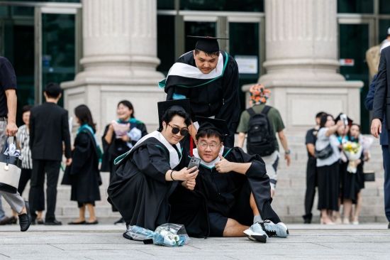 22일 서울 동대문구 한국외국어대학교에서 열린 '2025년 후기 학위수여식'에 외국인 졸업생들이 기념사진촬영을 하고 있다.