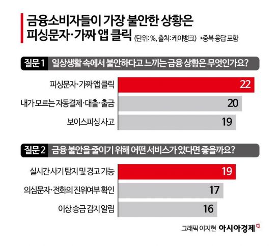 고객들은 피싱문자와 가짜 앱을 클릭했을 때(22%)를 가장 불안하다고 답했다. 내가 모르는 대출이나 출금, 자동결제가 이뤄지는 경우도 20%를 차지했다. 가장 널리 알려진 금융사기 수법인 보이스피싱 사고(19%)도 여전히 불안해하는 것으로 나타났다. 케이뱅크는 "금융사기 수법이 점점 고도화하면서 진짜와 가짜를 구별하기 어려워진 데다 피해 발생 시 이를 즉시 인지하거나 대응하기 힘들다는 점이 고객 불안을 더욱 키우고 있다"고 설명했다.