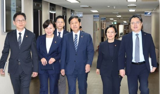 구윤철 경제부총리 겸 기획재정부 장관을 비롯한 경제부처 장관들이 22일 서울 종로구 정부서울청사에서 새정부 경제성장전략 관련 관계부처 합동 브리핑에 입장하고 있다. 왼쪽부터 배경훈 과학기술정보통신부 장관, 송미령 농림축산식품부 장관, 구 부총리, 한성숙 중소벤처기업부 장관, 문신학 산업통상자원부 1차관이 참석했다.