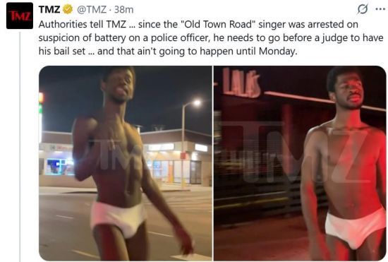 22일(현지시간) AP통신과 미 일간 뉴욕타임스(NYT) 등에 따르면 로스앤젤레스(LA) 경찰국 대변인은 전날 오전 5시50분쯤 LA 스튜디오시티 부근 벤투라 대로에서 거의 나체인 남성이 도로를 활보하고 있다는 신고를 받고 출동했다가 흰색 속옷과 카우보이 부츠만을 착용한 채 걷고 있던 릴 나스 엑스를 발견, 현장에서 체포했다고 밝혔다.