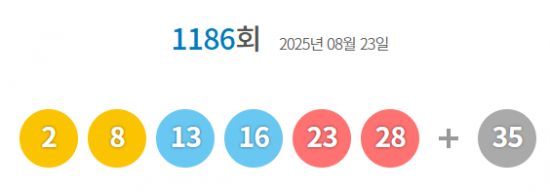 23일 진행한 제1186회 로또복권 추첨에서 1등 당첨번호로 2, 8, 13, 16, 23, 28번이 뽑혔다. 2등 보너스 번호는 35다.