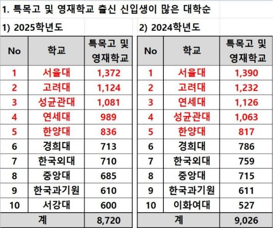 2025학년도 대입에서 영재학교·특수목적고(특목고)·자율형사립고(자사고) 출신 학생들이 가장 많이 진학한 대학은 서울대, 고려대, 성균관대 순으로 나타났다.