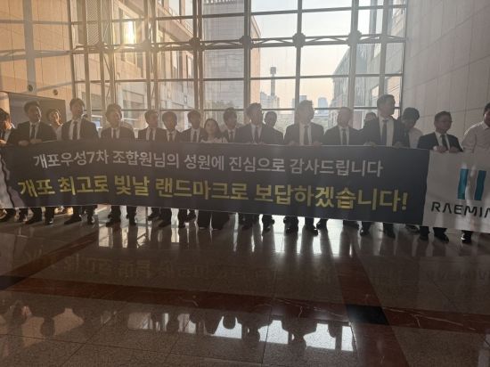 지난 23일 개포우성7차 재건축 조합이 개최한 시공사 선정 총회에서 68표 차로 삼성물산이 대우건설을 누르고 시공사로 선정됐다. 선정 직후 임직원들이 현수막을 들고 조합원들에게 인사하고 있다. 한진주 기자