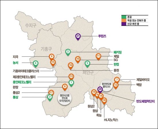 기흥구 지곡일반산단의 경우 램리서치의 한국법인과 ㈜서치앤델브 등이 입주하면서 기반시설 조성은 물론, 입주기업에 시설 인계까지 완료되면서 산단 준공을 눈앞에 두고 있다. 양지면에 조성 중인 제일일반산단 역시 ㈜테스, ㈜피티씨, ㈜에스엔씨솔루션 등 반도체 기업들이 속속 둥지를 틀 예정이다.