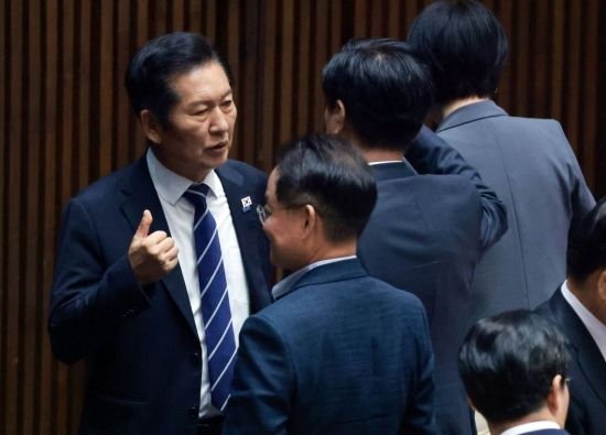 정청래 더불어민주당 대표가 25일 국회에서 열린 본회의에서 당 의원들과 대화하고 있다.