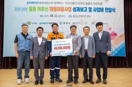 포스코 광양제철소(소장 고재윤)가 지난 22일 광양시 중마노인복지관 강당에서 광양지역 내 홀몸 어르신들의 행복과 건강을 응원하는 '홀몸 어르신 마음이음 프로그램' 사업비를 전달하며 지역사회와의 동행정신 실천에 앞장섰다.