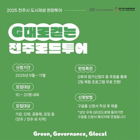 시 관계자는 "G-투어는 도시재생과 지속가능한 전주의 가치를 이해하고 공감할 수 있는 살아있는 현장 프로그램이다"며 "시민들의 많은 관심과 참여를 부탁드린다"고 말했다.