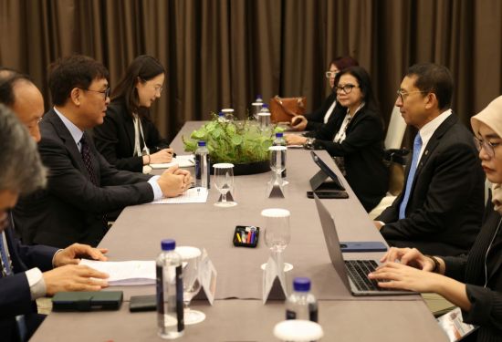 최휘영 문화체육관광부 장관이 27일 'APEC 문화산업고위급대화'가 열리고 있는 경북 경주 힐튼호텔에서 파들리 존 인도네시아 문화부 장관과 양자회담을 하고 있다. [사진 제공= 문화체육관광부]