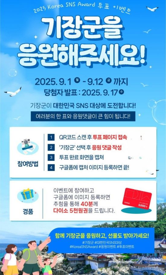기장군(군수 정종복)은 '제15회 대한민국 SNS 대상'에 도전하며 군민 참여를 유도하기 위한 '투표 인증 SNS 이벤트'를 9월 1일부터 12일까지 진행한다고 27일 전했다.