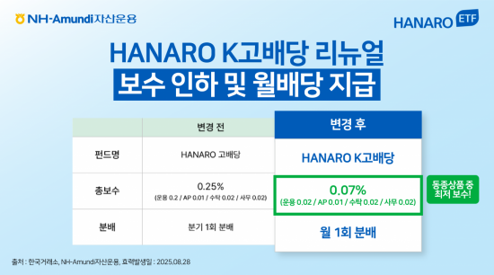 NH-Amundi자산운용은 HANARO 고배당 상품 명칭을 'HANARO K고배당'으로 바꾸고 총보수를 0.07%로 낮췄다고 28일 밝혔다.