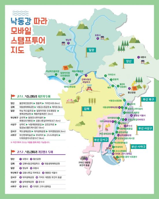 낙동강을 인접한 7개 지자체(경남 양산시, 김해시, 밀양시, 부산 북구, 사상구, 강서구, 사하구)로 구성된 낙동강협의회는 오는 9월 1일부터 7개 도시의 가을철 대표 관광지를 테마로 한 '낙동강 따라 가을명소 스탬프투어'를 운영한다.