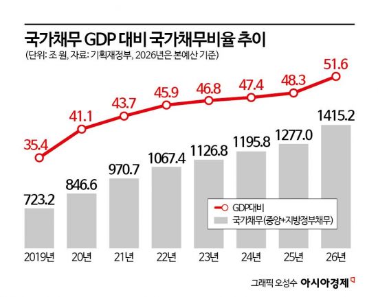 재정 적자가 쌓이며 내년 국가채무는 올해 본예산(1273조3000억원) 대비 141조8000억원가량 늘어난 1415조2000억원에 달할 전망이다. 국가채무는 내년 이후에도 2027년 1532조5000억원, 2028년 1664조3000억원, 2029년 1788조9000억원으로 불어나며 나랏빚 증가세가 가팔라질 전망이다. 국내총생산(GDP) 대비 국가채무 비율은 올해 48.1%(본예산, 2회 추경 기준 49.1%)에서 내년 51.6%로 50%를 넘어서고, 4년 뒤에는 58.0%까지 10%포인트 치솟는 등 GDP가 늘어나는 속도보다 나랏빚이 불어나는 속도는 더 빨라지고 있다.